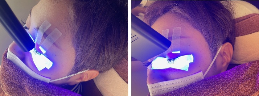 LEDライトを照射し接着面を硬化させます。通常のマツエクよりも持続力が長く、短時間で硬化します。
